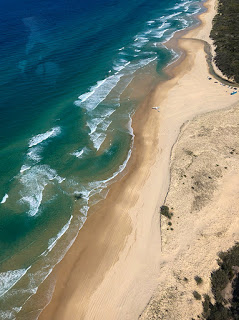 Our flight climbed to 1500ft and turned briefly over the sea looking for any dolphins, turtles, manta rays, stingrays or whales, which were just starting to pass Hervey Bay on their annual migration. Nothing this time so we turned inland over the enormous forests with a clear view of the whole island, all 123-KM of it from north to south and 22-KM east to west. Then, turning again to fly over several of the perched lakes, remote 4WD tracks and sand dunes. And back over to the sea again banking steeply side to side looking for wildlife in the crystal clear water.