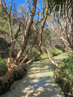 Further up the coast was our first stop at a spot called Eli Creek. The creek is one of many that fresh filtered water bubbles up from the underground aquifer and onto the beach but this one is particularly gushing with 4-million litres of pure, fresh water heading out to sea every hour. A boardwalk has been constructed so you can walk along the creek and then float back in the current or paddle back to the beach. It was a little chilly in the shade this morning so a quick digit test of the water and a photo had to suffice. During the high season, apparently, it’s crowded here with often 6-coach loads of tourists all wanting a dip. We were lucky being late in the season, it was almost deserted.