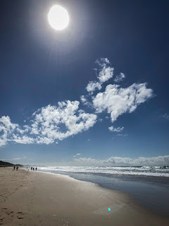 The warm breeze from the sea increases the humidity and salt spray in the distance limits the view but it is still a comfortable temperature for a good walk. A brisk walking pace is made easy with well compacted sand, which is spotlessly clean with no wind blown junk or plastics but surprisingly few seashells scattered around.