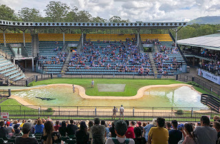 We had arrived just as the crocodile display was about to began and quickly made our way to the Crocoseum, a huge, open air auditorium with a large, shallow pool where the ‘performing’ crocodiles come to feed. I say performing, a large carnivorous animal that can trace its origins back to the dinosaur period, does what it likes, when it likes. But the opportunity of a good feed is too tempting an offer for Alan the saltwater crocodile who takes his time to make an entry despite the encouragement of the handlers. Steve wanted to show crocodiles in a more visual way than through the usual murky waterholes and built the clear water pool in the Crocoseum to that end.
