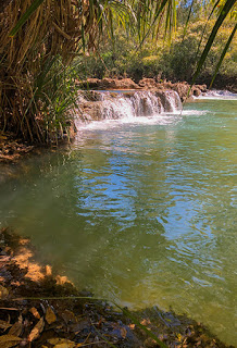 We were just approaching the end of the first pool and a large rock wall blocking the flow of the river. At this point a 400-metre walk takes us past 20,000-year old rock paintings and a great location for photographs of the gorge walls reflected in the water. And at the end of the walk is our second boat ready to take us further up the river.