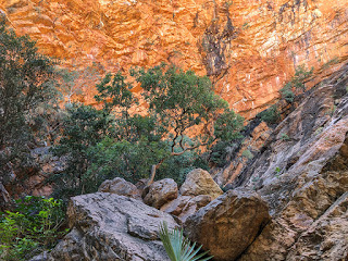 Here, over tens of thousands of years, water has penetrated cracks in the rock creating the gorge and its micro climate shaded from much of the intense sun. It is full of life. Towering Livistona trees line the creek that flows from the gorge backed by bright orange sandstone cliffs. Ferns thrive in the shade and provide habitat for small lizards, insects and frogs. Harmless Golden Tree Snakes are common but recent sightings of the highly venomous Death Adder means keeping a close eye on where you place your feet.