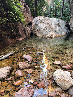 Deeper into the gorge we came to an abrupt stop where an enormous boulder had fallen reaching out to both sides of the gorge wall and blocking any further progress. A small waterfall fed the clear pool where we stopped to take a few photographs before heading back the way we came.