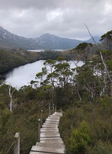Lilla Lake is a good spot to take a breather before climbing the sturdy timber steps. On a calm day the lake acts like a mirror with Dove Lake glistening in the background. As we approached, however, gusting winds were stirring the surface of the water and taking on the colour of the deepening grey sky.