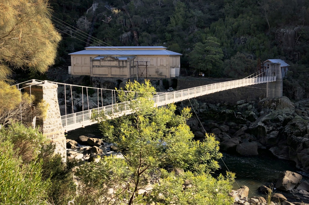 The trail is a moderate walk with a steady incline and a number of steps as you approach the Duck Reach Suspension Bridge. On crossing the bridge there are two further tracks – the steep Reed Gully and Snake Gully. Both are for experienced and energetic hikers and form a 2km return track to First Basin. But we were here to see the now disused Duck Reach Hydro-Electric Power Station.