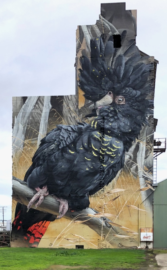To the left of the silo, and partly obscured by a steel fence, is another highly detailed mural by Sam Bates, this time of a Red-Tailed Black Cockatoo. Many people were unaware of the second mural and so Sam returned to paint the wall in front of the silo in May 2023 to link both murals together while giving the visitor a rare close-up view of the stunning detail of the artwork.