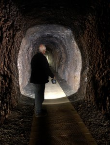 Close to the tunnel’s entrance a 100-metre shaft was sunk (later extended to a depth of 140-metres). To extract the silver-ore from the mine, steam-powered winding gear and the headframe needed to be constructed but this lead to a problem – the tunnel was too narrow for the steam boiler to be transported from Zeehan. The solution was to increase the height at the top and width of the upper sides of the tunnel giving it its classic keyhole shape.